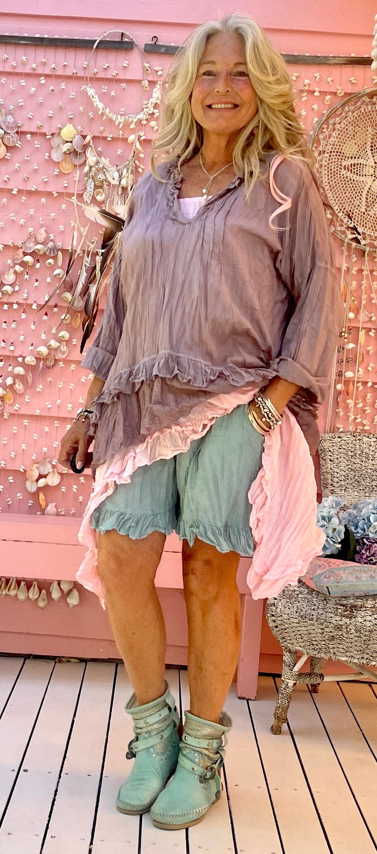The sweetest beachy shorts, simple and sweet with pockets...such a loose comfy fit. Some have a double frill and some a single frill.