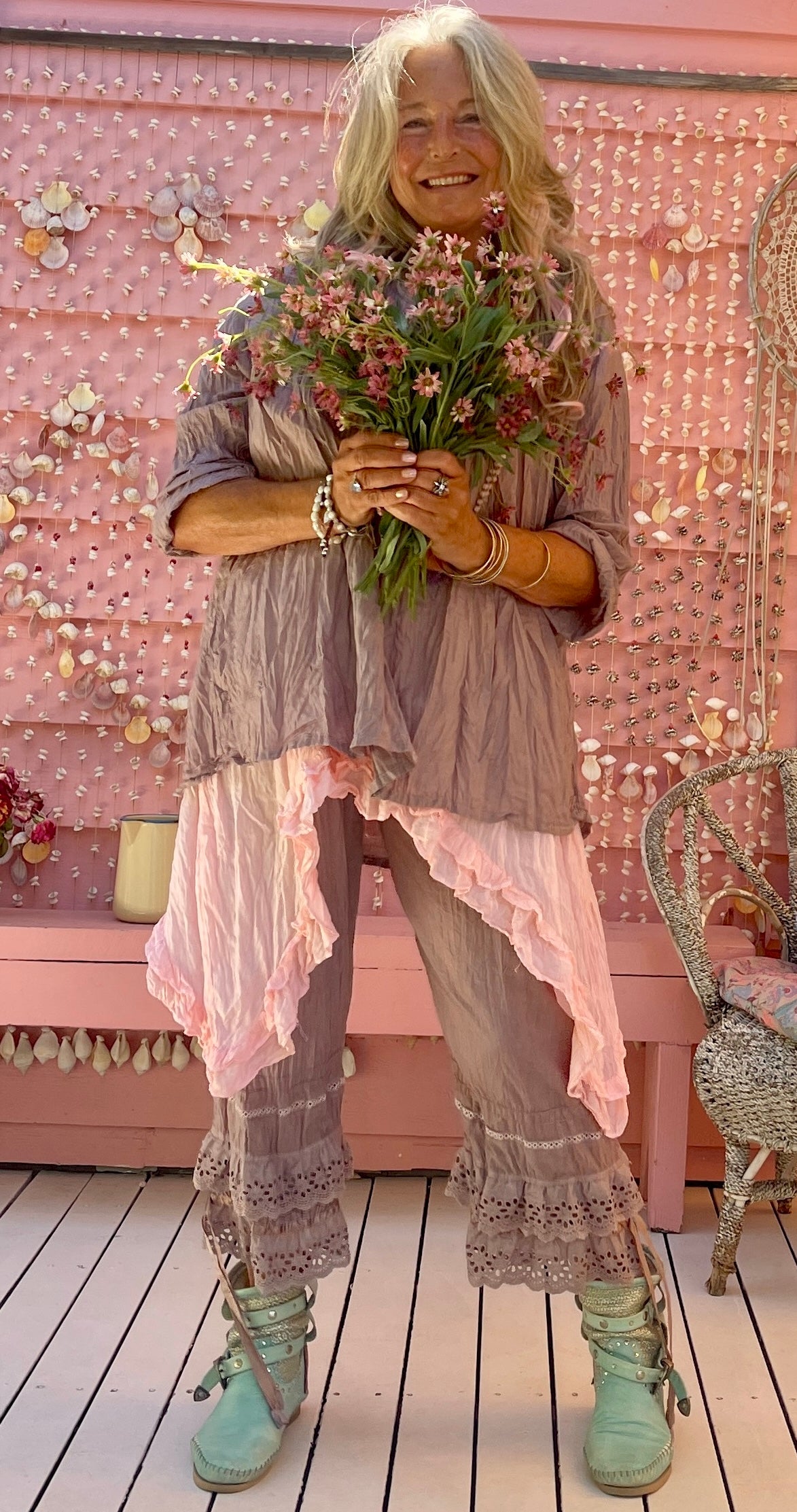 Our best seller for 10 years! They are the sweetest pair of pantaloons with the two rows of adorable lace trim and the cutest ribbons. They are high waisted with an elastic waist band that makes them super comfy. They are the perfect pants to wear under anything Sea Gypsy. Loving that boho, shabby chic, Little House on the Prairie, I am too cute for words thing.