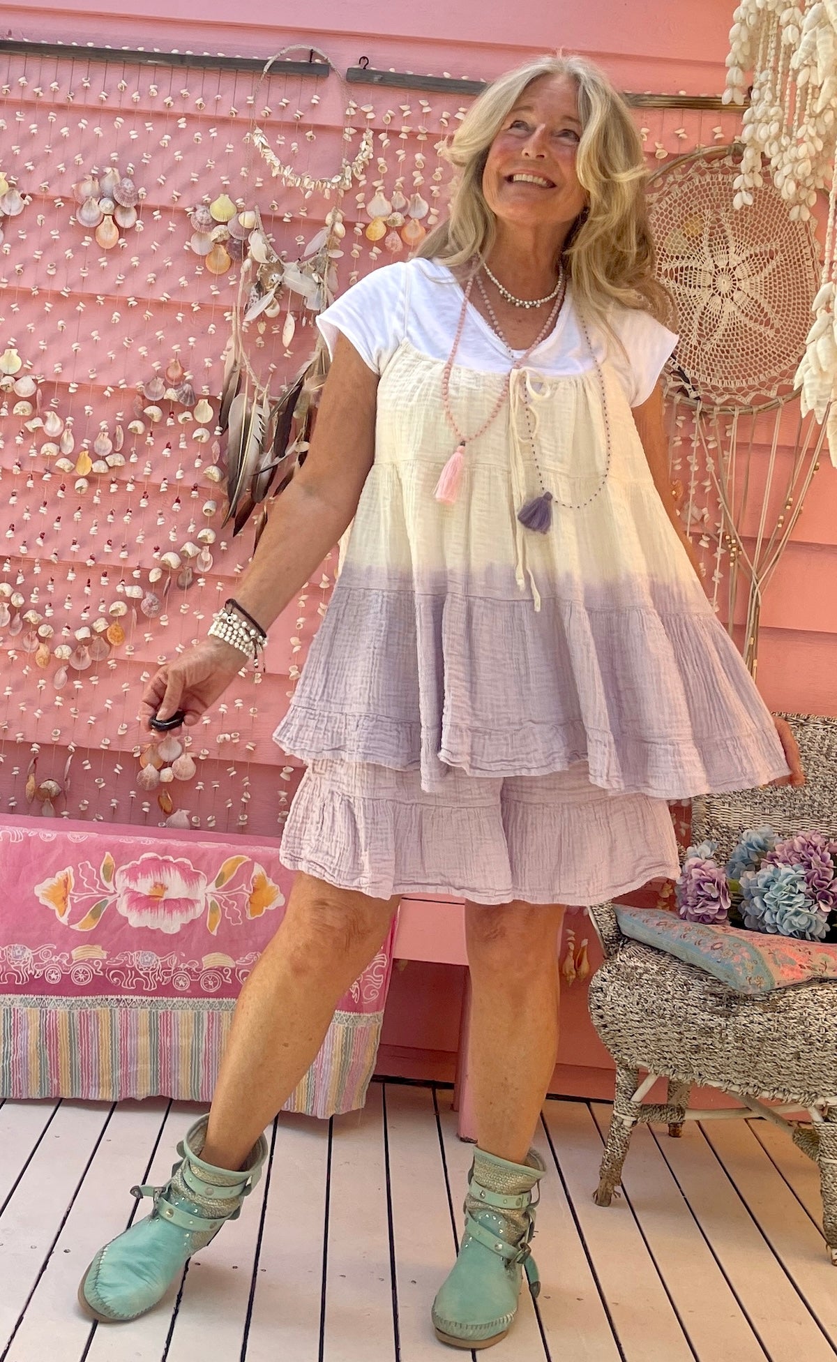 The delightful flowy Gidget Top. Made of natural, lush double cotton and lovingly hand-dyed. Soft Pastel, Dip-Dyes and funky tie-dyes. This sweet top is a layered baby doll style and has adjustable ties. Just perfect over the Sweety Shorts or just wear it over your shorts and bathers.