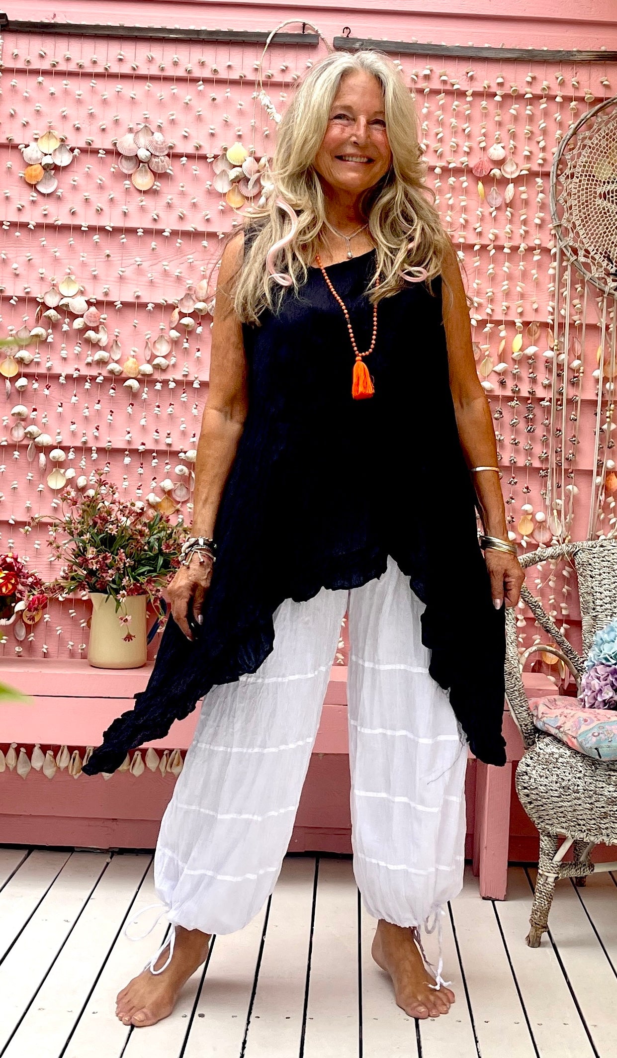 Meet your new boho obsession—harem pants designed for maximum comfort and style. With a roomy waist featuring smooth, wide shirring, these pants are made for moving freely. Tie-up cuffs add that finishing touch, while the gently billowed legs keep things breezy and effortless. Layer them under our Summer Moon Tops or a Shelly Shirt and you'll find yourself reaching for every shade. These little legends are about to become your go-to pair.