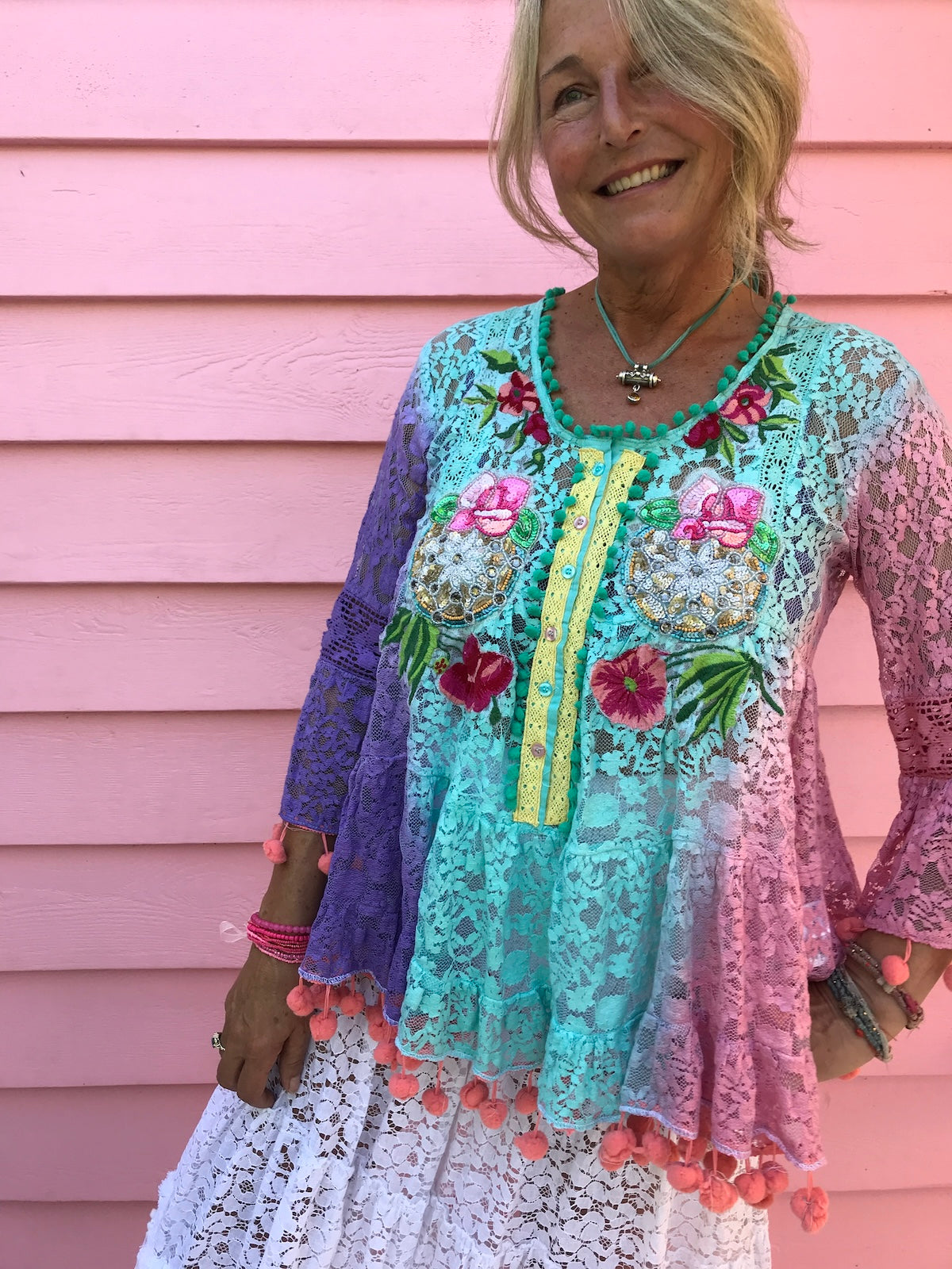 Straight from the legendary Antica Sartoria Positano—the birthplace of Boho chic—comes a rare gem: a discontinued vintage treasure you won’t find anywhere else. This stunning top bursts with vibrant pom poms, colorful buttons, delicate hand embroidery, sparkling sequins, crochet, and lace. It’s a singular, show-stopping piece of boho art made just for you, fitting M/L perfectly. Check our size chart to snag your ideal fit and own a forever-fabulous favourite.