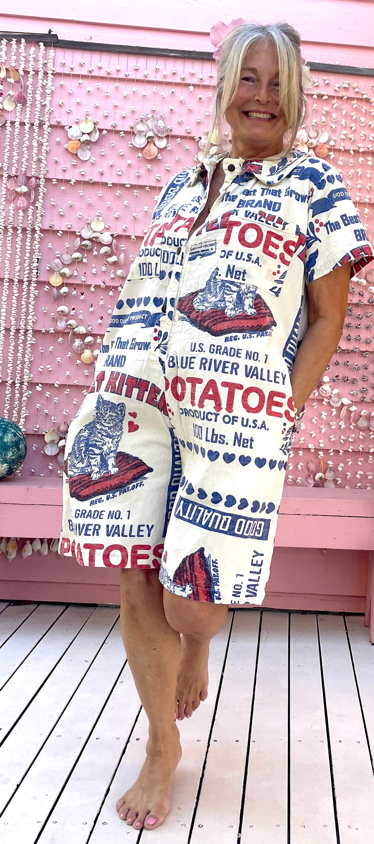 Waste not Want Not! I Delightful Depression Era Sack Designs. Crafted from charming repurposed flour sack fabric, each pair tells its own colourful story with unique patterns and vintage character. These comfy, fun shorty jumpsuits are roomy and comfy with deep pockets. They are one size only but do give a lot and after washing become soft and cosy. Limited numbers mean be quick with these quirky cuties.