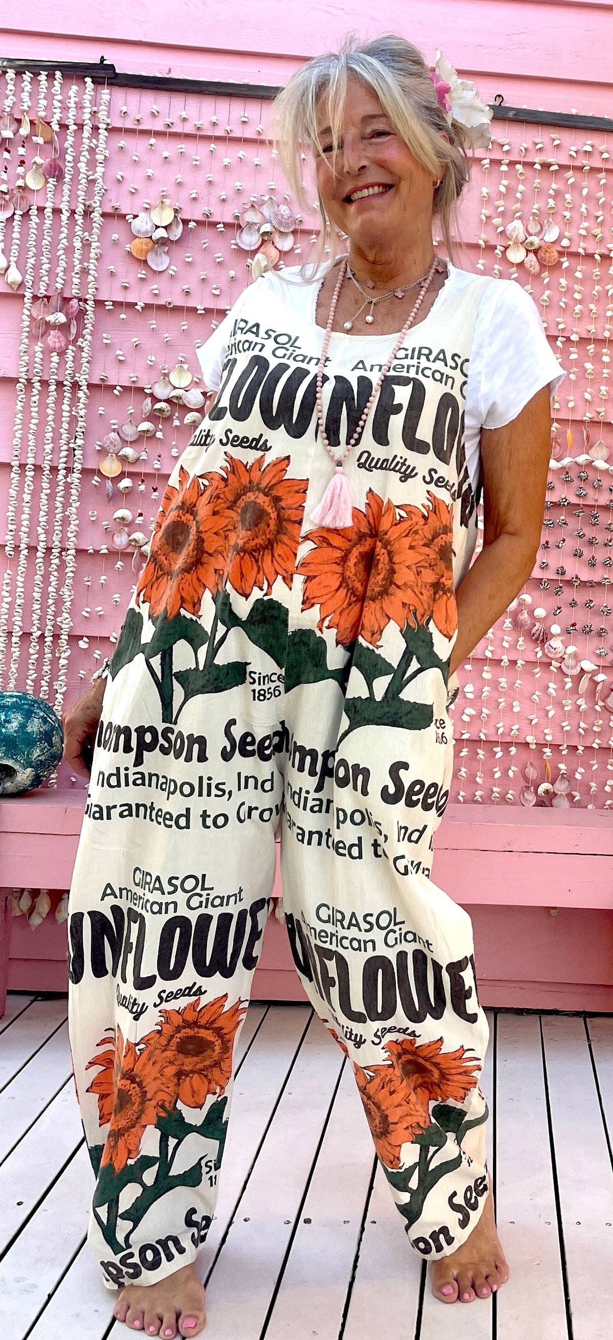 Waste not Want Not! I Delightful Depression Era Sack Designs. Crafted from charming repurposed flour sack fabric, each pair tells its own colourful story with unique patterns and vintage character. These comfy, fun rompers are roomy and comfy with deep pockets and are adjustable with tie straps. They are one size only but do give a lot and after washing become soft and cosy. Limited numbers mean be quick with these quirky cuties.